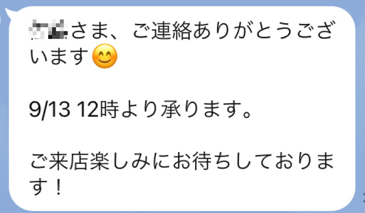 最後に確認のメッセージを送らせていただきご予約完了となります。